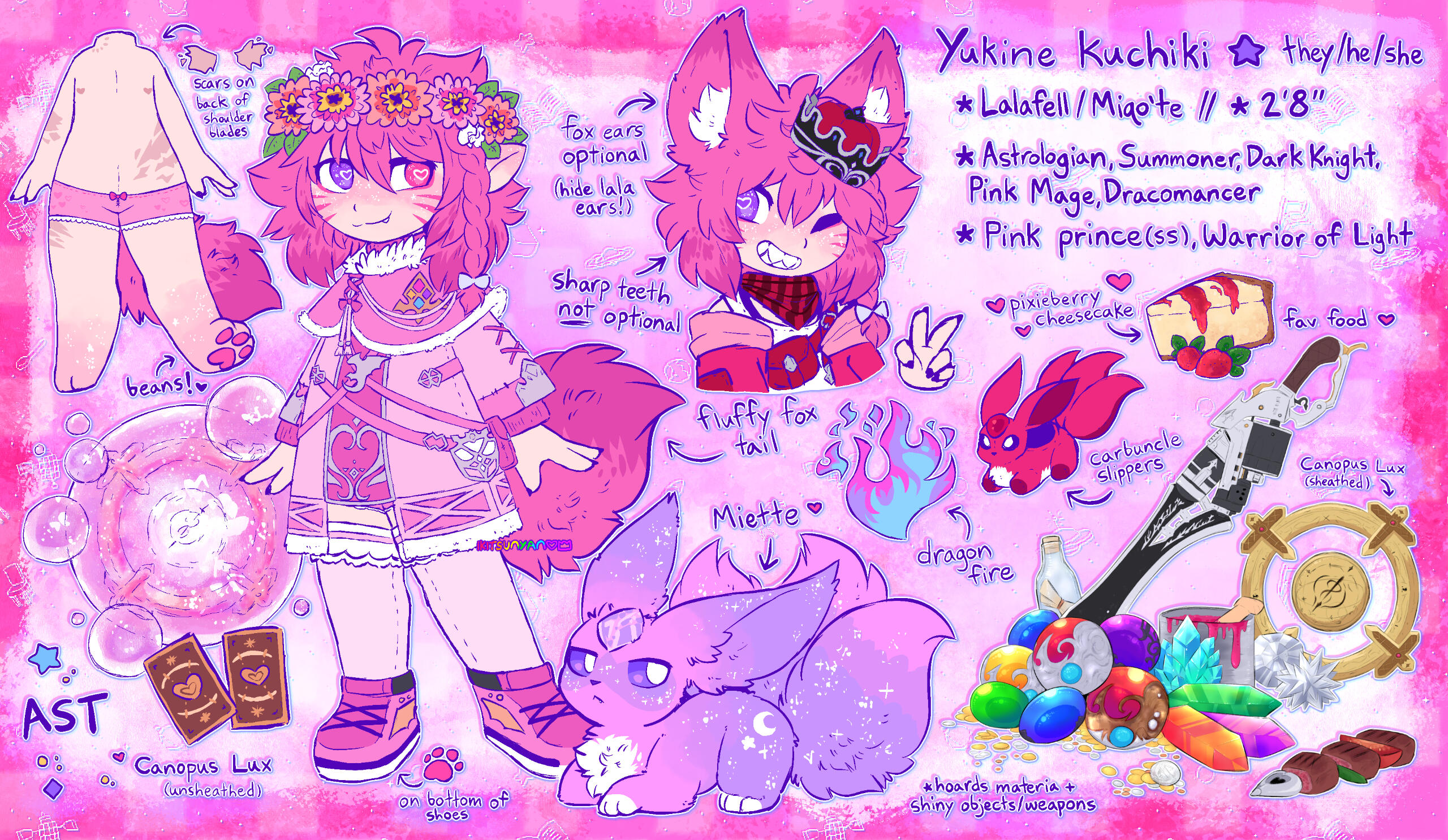 hai!! my name is kit, you can call me that or my characters' names, whatever strikes ur fancy! i'm nyanbinary and i go by they/them pronouns, though frankly i don't have much care for what pronouns you wanna call me, especially in character :3 i'm an adult (21+), i like ffxiv and pokemon and among us, and also i like anime/manga and i have like a million ffxiv characters but of course yukine is my main >w< for more info about me (so i don't ramble on and on about my special interests) u can check out my main carrd here if you'd like!!